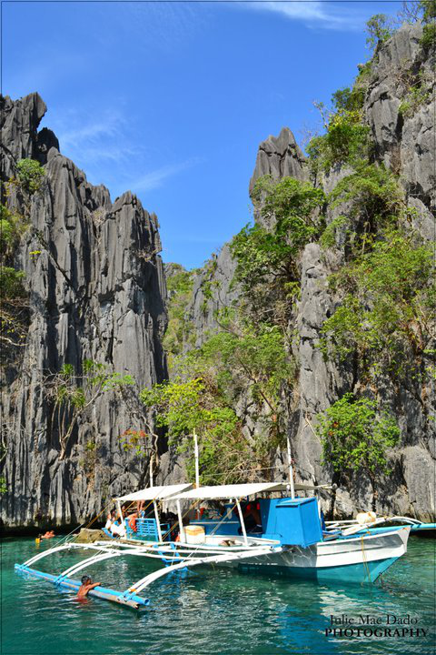 Boat beside tall cliffs in Palawan. Photo by Julie Mae Dado.