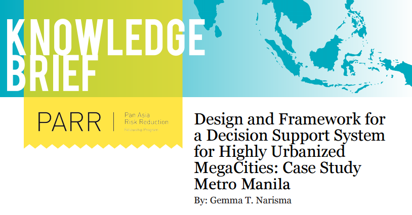 “The objective of this project is to create the design and framework of a decision support system for extreme events for Metro Manila. The system is intended to be an integrated platform for assessing hazards, exposure and vulnerabilities. This project highlights the learning of the PARR fellow during the visit to the NCDR, which was geared towards enhancing the Manila Observatory’s approach for effective science information communication towards risk reduction. Given the high exposure and pre-existing vulnerabilities of Metro Manila to current and future hazards (due to extreme events), it is important to begin exploring the potential establishment of a holistic and integrated decision support system that is applicable especially to highly urbanized megacities such as Metro Manila.” (Excerpt from Pan-Asia Risk Reduction (PARR) Knowledge Brief No. 1)