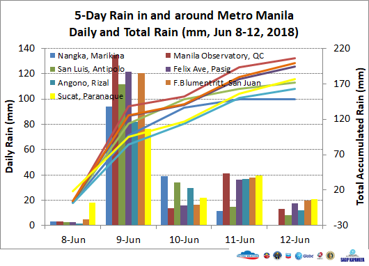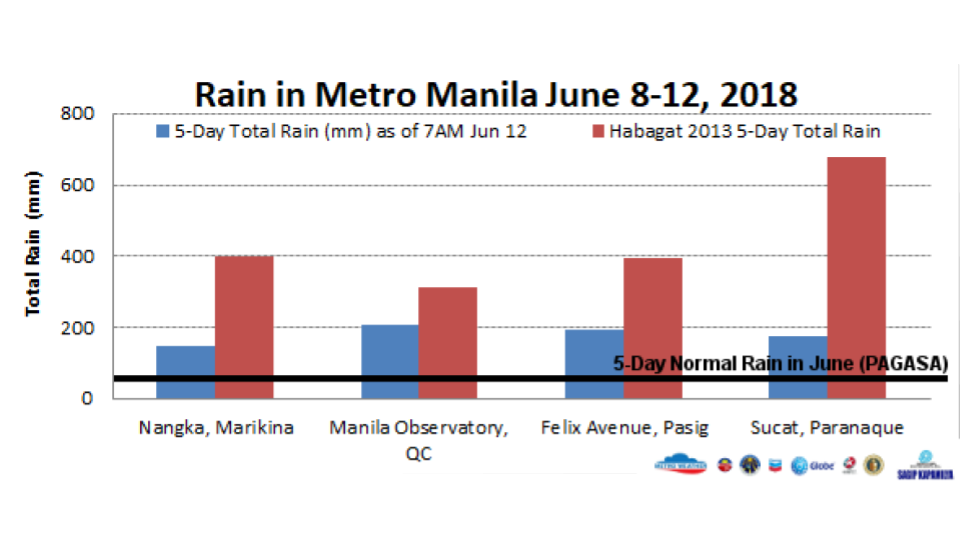 Rain due to the enhanced habagat totaled ~150-200 mm the past 5 days from weather stations in and around Metro Manila. The greatest observed total rainfall (206.4 mm as of 7 am, June 12, 2018) was observed in Manila Observatory, Quezon City. The rainfall totals the past 5 days are still lower than the Habagat 2013 totals, which caused widespread flooding in Metro Manila. The 5-day rainfall in Metro Manila is more than twice higher than the 5-day normal rainfall in June (Science Garden, PAGASA).