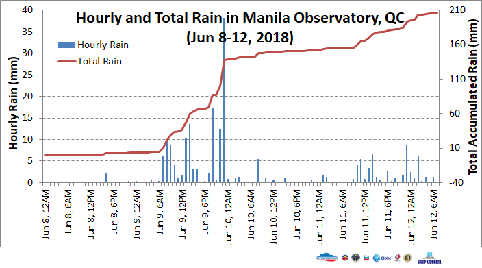 Hourly and Total Rain at Manila Observatory, QC (June 8-12, 2018)