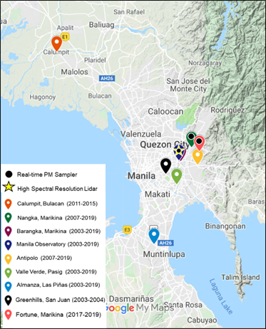 Figure 1. PM2.5 filter-based and continuous sampling measurement locations during the New Year (2003-2019). We note that Greenhills, San Juan and Calumpit, Bulacan are not sampling sites in recent years but are included here and in Figure 2 for reference. Fortune, Marikina City is a recent addition to Manila Observatory’s (MO) New Year sampling locations. In addition to the filter-based and continuous PM samplers, a High Spectral Resolution Lidar (HSRL) was also installed this year at the Manila Observatory.