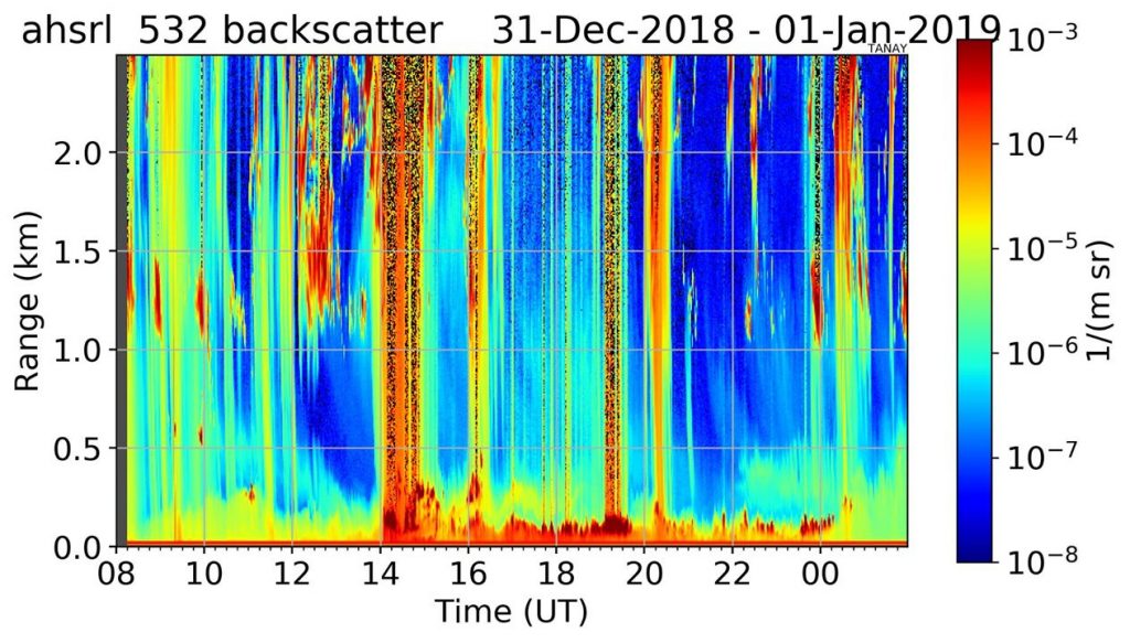 In addition to data from in-situ PM2.5 samplers, a High Spectral Resolution Lidar (HSRL) was also collecting vertical profiles of aerosol backscatter data at the Manila Observatory site during the New Year’s festivities (Fig. 6). The HSRL is a light detection and ranging instrument that makes use of laser light in the visible and infrared regime (green light at 532 nm wavelength and infrared light at 1064 nm) to determine the aerosol size and composition in the ambient atmosphere within and above the boundary layer. The HSRL from the University of Wisconsin was installed at the Manila Observatory in December 2018 to obtain a year-long baseline ground-based remote sensing data on aerosol size and composition in preparation for CAMP2Ex, the NASA Airborne field campaign, in July 2019. Figure 6 shows the HSRL’s green laser light visible in the night sky during the New Year 2019 revelries.