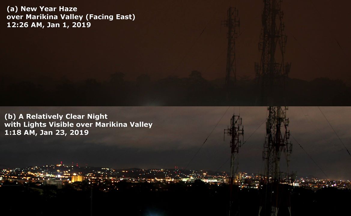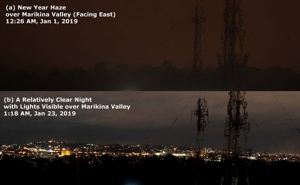 The aerosol enhancement observed during the 2019 New Year’s eve celebrations in Metro Manila caused visibility reduction all around. Marikina Valley was covered in the smoke from fireworks and firecrackers. And from Manila Observatory, at midnight, the lights (Figure 9b) from the houses and buildings in Marikina Valley could not be seen (Figure 9a).