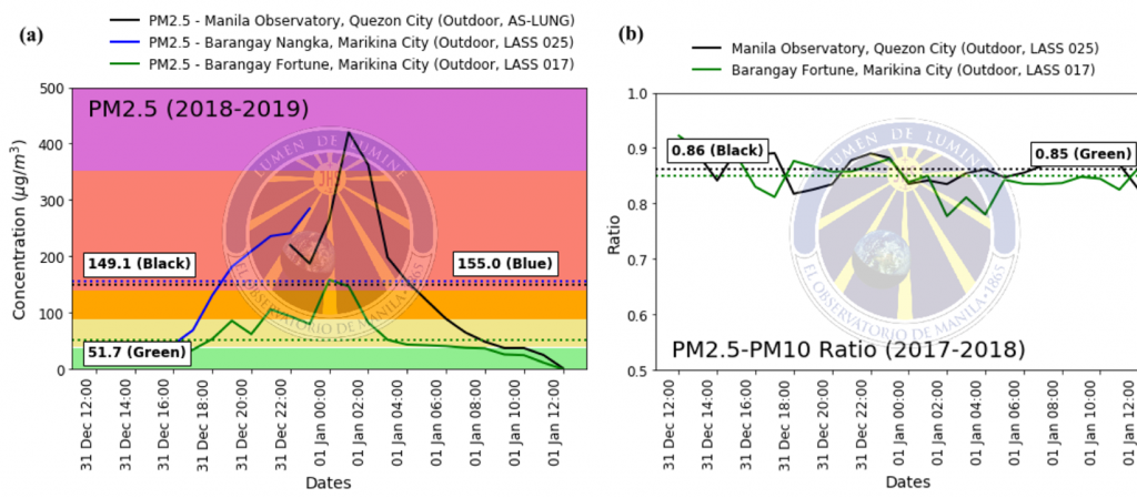 We note that in recent years, we also deployed indoors a continuous PM2.5 LASS sampler in Manila Observatory, Quezon City. Our previous results showed that even inside, in environments where the ambient outdoor air is able to penetrate indoors (through open windows and through the building itself), air pollution from the New Year’s Eve event is bad enough to be of concern. The extent that outdoor particles are able to penetrate indoors is dependent on a variety of factors, including the building shell, particle penetration efficiency, and particle deposition rate (California Air Resource Board, 2004). To avoid the effects of the pollution event, it is not sufficient to merely go indoors, since indoor air quality is already dangerous to health; instead, it is advisable to stay indoors in a room where the air is filtered.