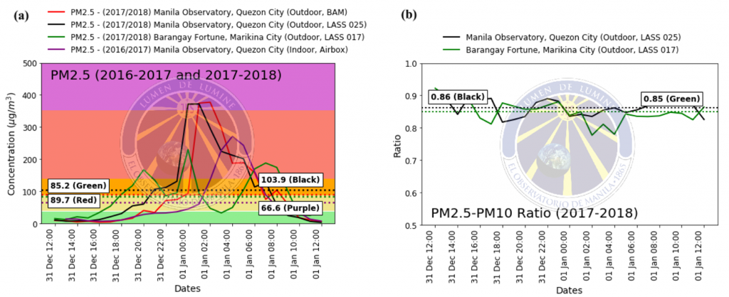 Figure 4. (a) Real-time PM2.5 concentrations for Manila Observatory, Quezon City and Barangay Fortune, Marikina City from 31 December 2017 (12 PM) to 1 January 2018 (12 PM) by various samplers and from 31 December 2016 (12 PM) to 1 January 2017 (12 PM) by the Edimax Airbox sampler, plotted over colors corresponding to the US EPA AQI for hourly PM2.5 (Table 2). (b) PM2.5/PM10 ratios during the sampling period in 2017 to 2018 for Manila Observatory, Quezon City, and Barangay Fortune, Marikina. The dashed lines indicate an average over the sampling period.
