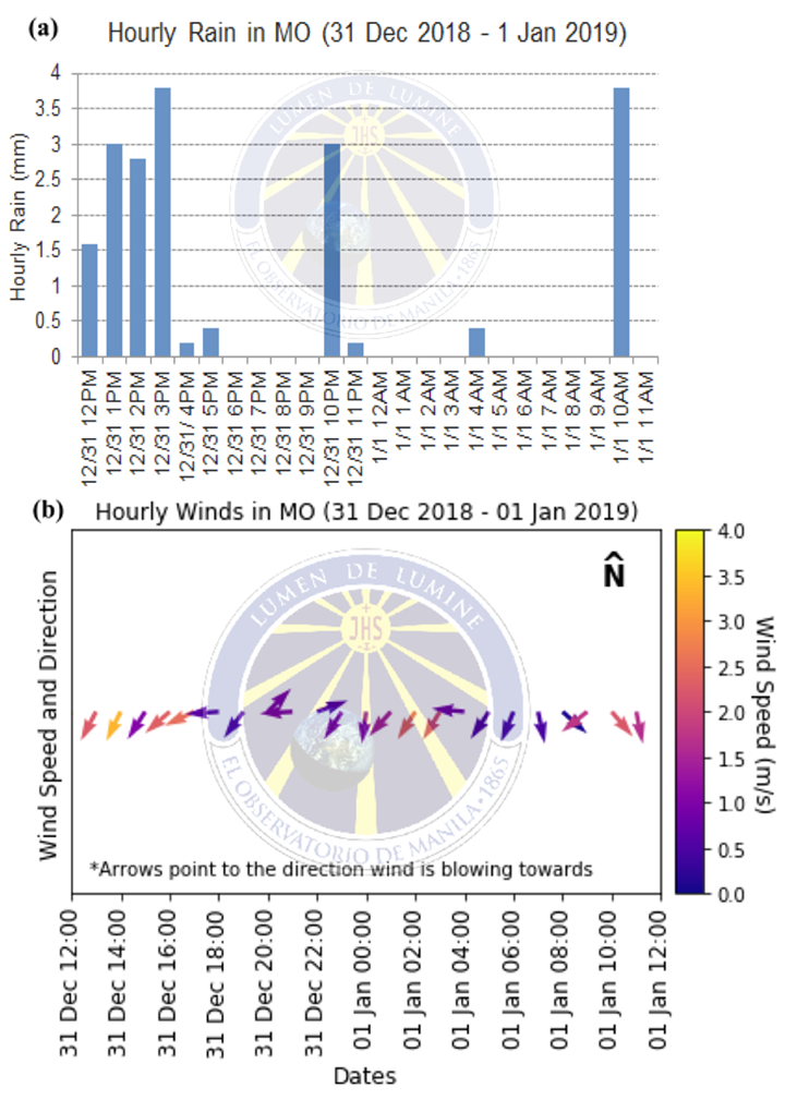 Figure 5. (a) Hourly rainfall and (b) wind speed and direction (arrows point to the direction wind is blowing towards) at Manila Observatory from December 31 (12nn) to January 1 (12nn).