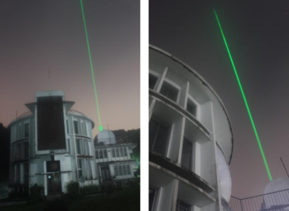 Figure 6. Green laser light from the University of Wisconsin’s High Spectral Resolution Lidar (HSRL) deployed at the Manila Observatory. The HSRL characterizes the vertical distribution of aerosol size and composition within and above the boundary layer of Metro Manila. Image courtesy of Ms. Genie Lorenzo.