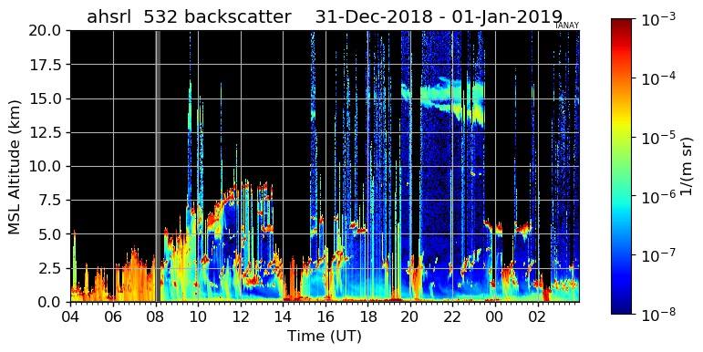 Figure 7. Aerosol backscatter from the High Spectral Resolution Layer (HSRL) at Manila Observatory from 31 December (12 n.n. local time, 04 UT) to January 1 (12 n.n. local time, 04 UT). Timestamp is in Universal Time (UT) and local time is UT + 8 hours.