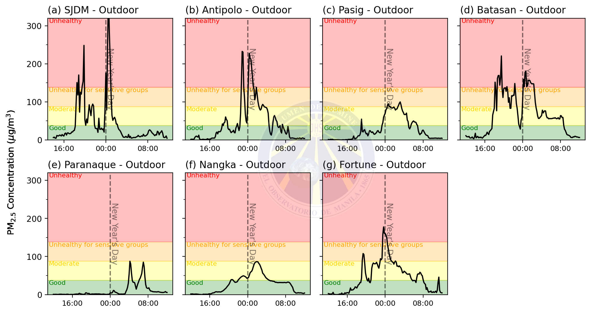 Reflecting the need for local air pollution assessments, especially in times of extreme pollution events, the Manila Observatory has been monitoring PM2.5 concentrations during New Year’s Eve celebrations since 1998. Several PM samplers, both filter-based and continuous real-time samplers, were deployed across Metro Manila and nearby locations this year. PM2.5 samples were collected on pre-conditioned Teflon filters (47-mm diameter, 2-μm pore size) using MiniVol Tactical Air Samplers (TAS) at a constant flow rate of 5 L/min. As indicated in Figs. 1 and A1, MiniVol TAS were deployed in six sampling sites: (1) Manila Observatory, Quezon City; (2) Nangka, Marikina; (3) Mambugan, Antipolo; (4) Valle Verde, Ugong, Pasig; (5) South Bay Gardens, BF Homes, Parañaque; and (6) Muzon, San Jose del Monte, Bulacan. The battery-operated portable samplers were scheduled to run from 12:00 p.m. of 31 December 2021 to 12:00 p.m. of 1 January 2022. After the 24-hour particle collection, the samples were analyzed gravimetrically for their masses. Real-time PM2.5 measurements were also collected to complement the filter-based analysis using the Academia Sinica (AS-LUNG) personal samplers in seven sites: (1) Mambugan, Antipolo; (2) Valle Verde, Ugong, Pasig; (3) South Bay Gardens, BF Homes, Parañaque; (4) Muzon, San Jose del Monte, Bulacan, (5) Batasan Hills, Quezon City; (6) Fortune, Marikina; and (7) Nangka, Marikina. This laser-based instrument determines PM2.5 mass concentrations every 15 seconds; hence, it is capable of assessing exposure levels to episodic pollution events (Lung et. al, 2020). In addition to the real-time PM2.5 measurements, an Environmental Beta Attenuation Monitor (E-BAM) was used and situated on the roof deck of the Ionosphere building of the Manila Observatory (~70 m.a.s.l.). The E-BAM measures the PM2.5 mass deposited on a beta-irradiated filter tape that advances mechanically every hour. Moreover, 6 available automated weather stations (AWS) were used to record the wind profile during the NYE celebrations. Two out of six AWS used were from Davis Instruments located in Manila Observatory and Nangka, and the rest were from Lufft Instruments deployed in different SM malls.