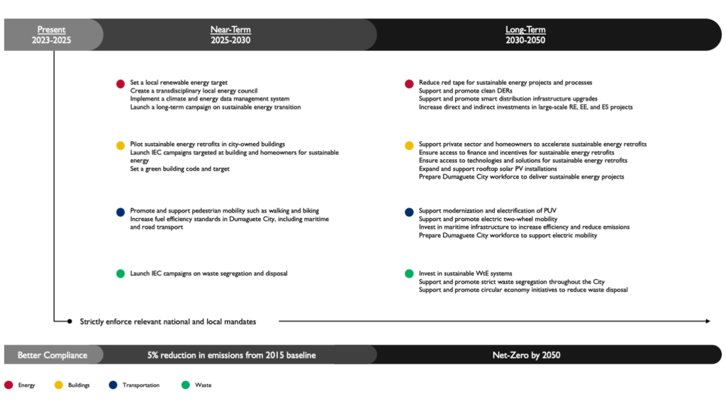 This roadmap should serve as a starting point for Dumaguete City to further study these pathways and engage with its constituents for in-depth studies and consultations. From the analysis, four key sectors emerged: energy, buildings, transportation, and waste. Within these sectors, a series of suggested strategies have been outlined, seen through a science-based framework, and aligned with current climate scenarios and pathways. These strategies provide a pathway for Dumaguete City to reach Net-Zero emissions by 2050, while simultaneously increasing energy access, security, and supply, with co-benefits across other