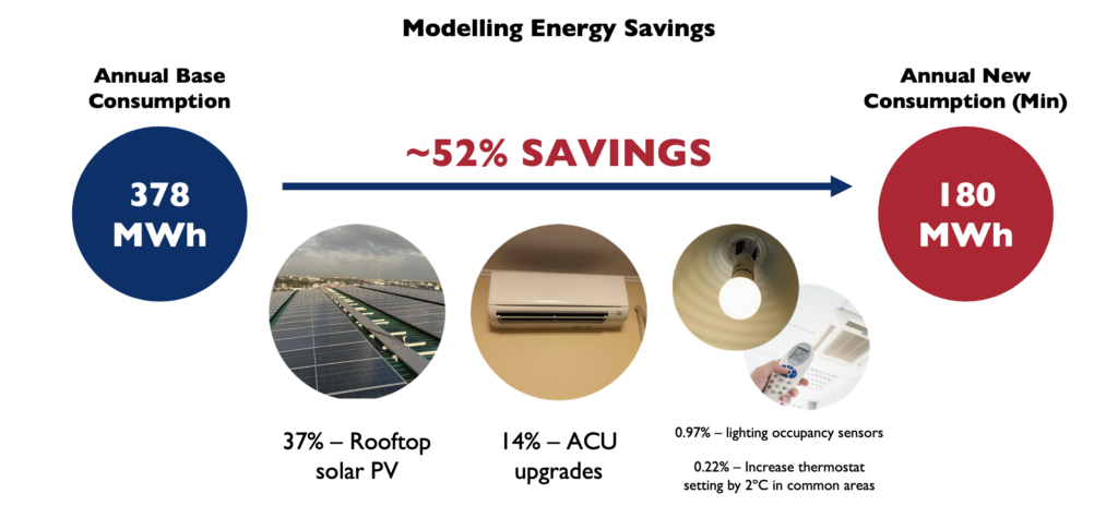 Modeled energy solutions and corresponding energy savings for Dumaguete City Hall Compound