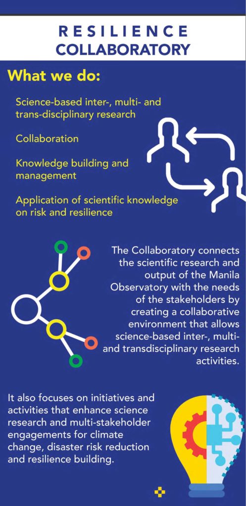 The Resilience Collaboratory runs activities and programs that aim to strengthen the resilience capacities of communities that are exposed to frequent hazards, to address local vulnerabilities, and to support efforts to adapt to disaster risks and climate impacts. The Resilience Collaboratory facilitates collaboration among the core laboratories of the Manila Observatory with a shared goal of delivering useful and usable climate and disaster risk information to the most vulnerable, and initiates trans-disciplinary partnerships with various institutions outside academia especially civil society organizations, and the public and private sectors.